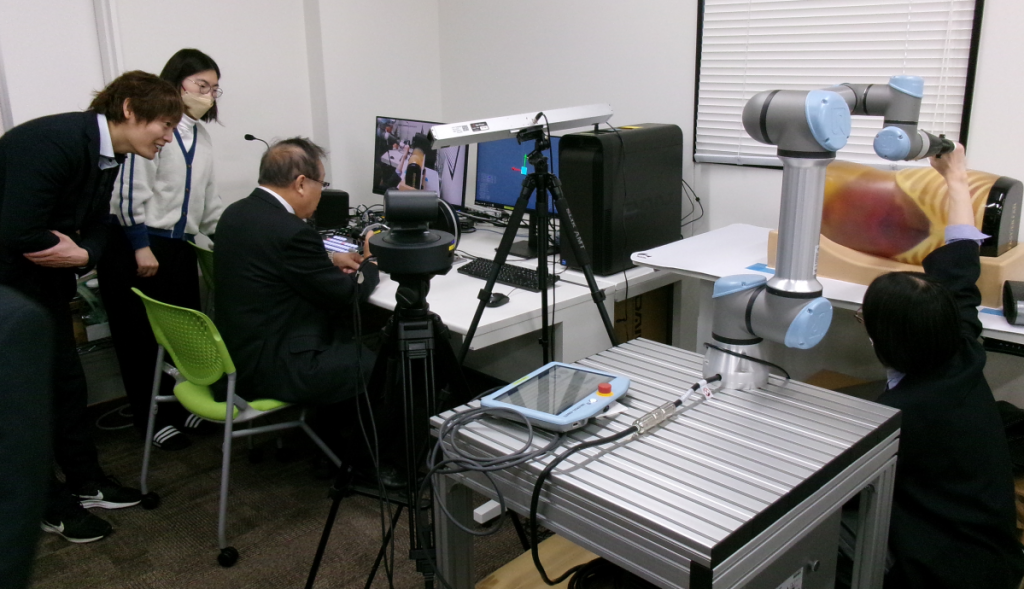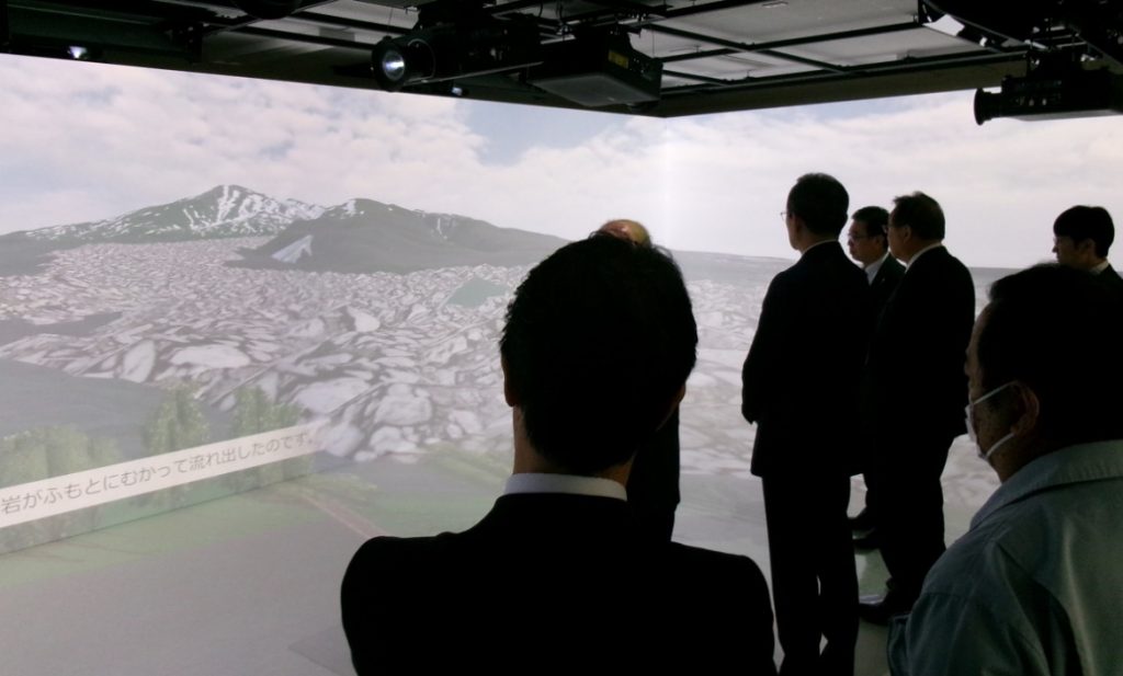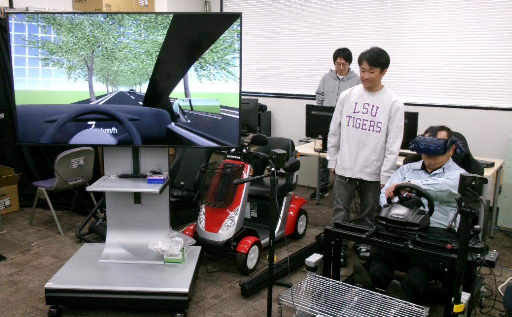 続いて、情報データ科学部1号館において大型XRシステムの体験を行っていただいたほか、先端研究実験室に設置されたVRドライビングシミュレーターやローカル5Gを活用した遠隔操作ロボット等に直接触れていただくなど各種研究設備をご覧いただきました。