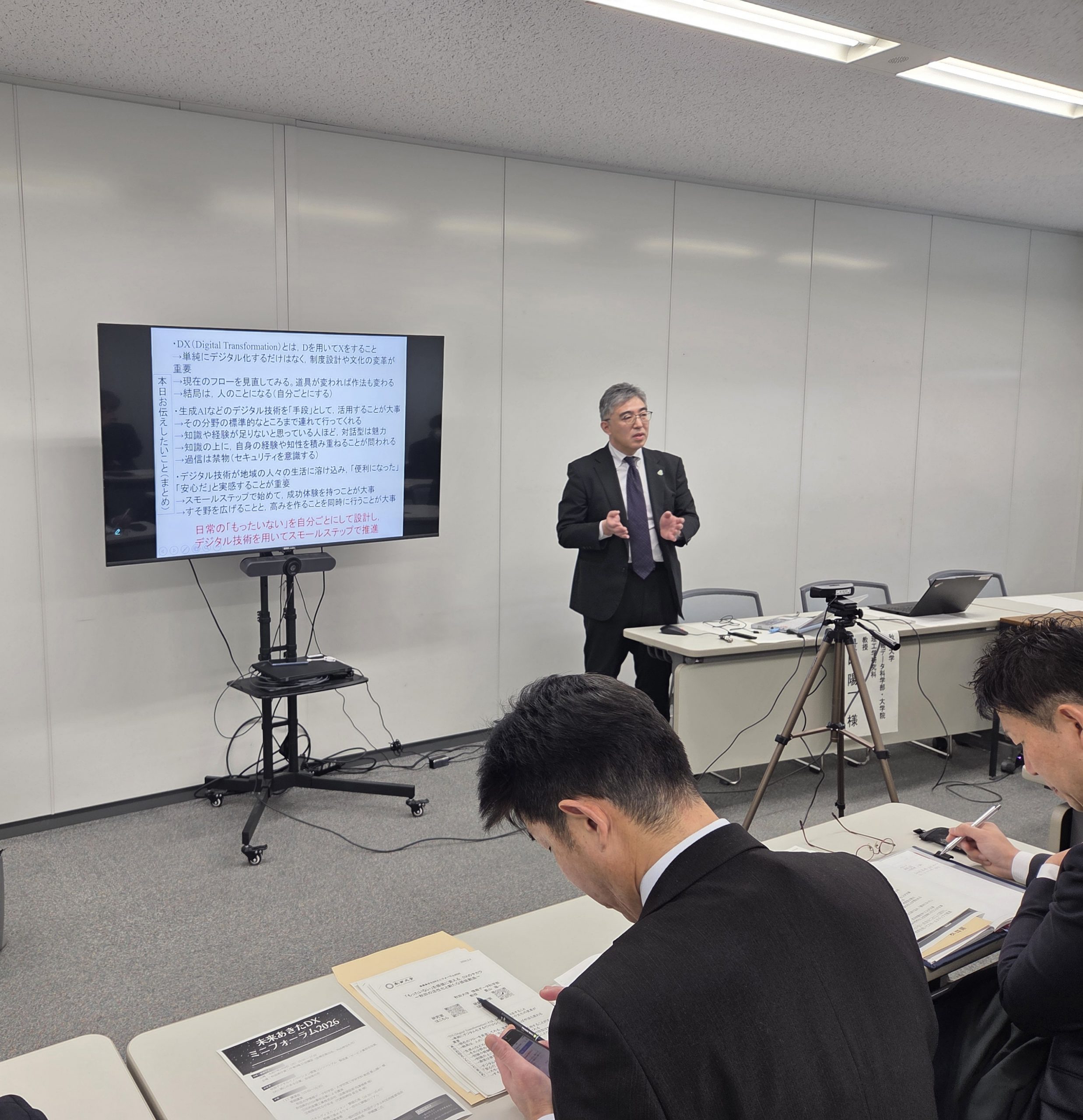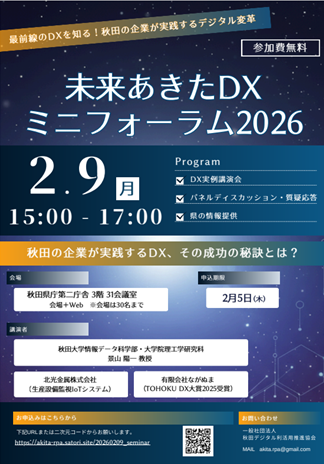 景山陽一教授が「未来あきたDXミニフォーラム2026」で講演しました 2026/2/102026年2月9日(月)、秋田県庁第二庁舎において、本学部景山陽一教授が「「もったいない」を価値に変える、DXのチカラ~秋田の活性化と新たな価値創造~」をテーマに基調講演を行いました。他にも、県内企業2社の方からDXによる業務効率化の実例紹介があり、本フォーラムに参加された企業の方などからは積極的な質問がありました。 また、後半は講演者達によるパネルディスカッションが行われ、DXを推進していくための方法について活発に意見交換が行われ、非常に有意義なフォーラムとなりました。
