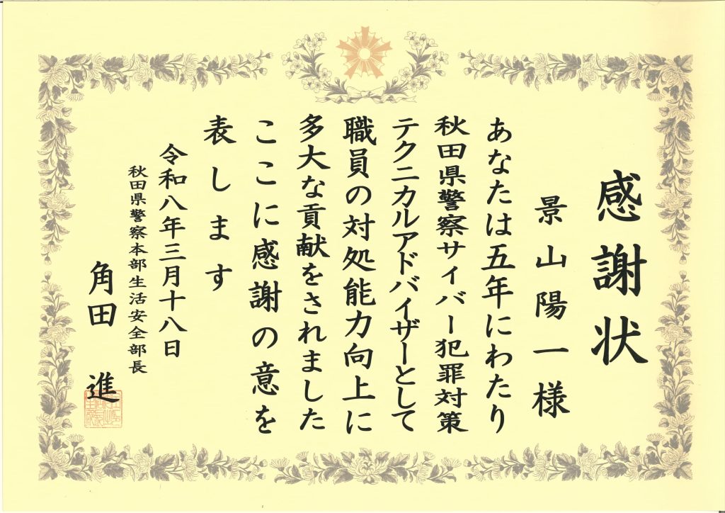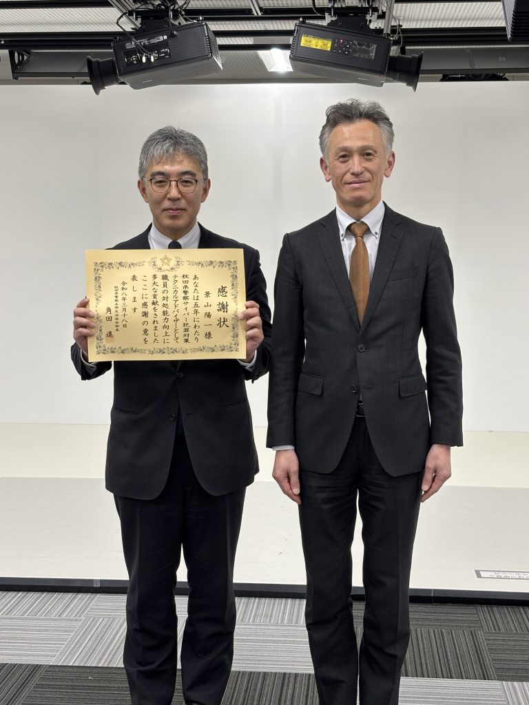 景山陽一教授が秋田県警察から感謝状を授与されました 2026/3/182026年3月18日、景山陽一教授が秋田県警察より感謝状を贈呈されました。これは、2021年から5年にわたり秋田県警察サイバー犯罪対策テクニカルアドバイザーとして活動し、秋田県警察職員の対処能力向上に貢献したことによるものです。