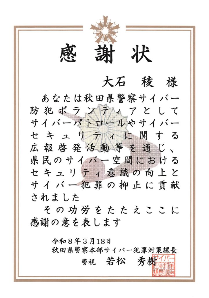秋田県警察大学生サイバーボランティアとして、サイバーパトロールやサイバーセキュリティに関する広報啓発活動などを行い、サイバーセキュリティ意識の醸成に貢献したとして、以下の学生に秋田県警察から感謝状が授与されました。