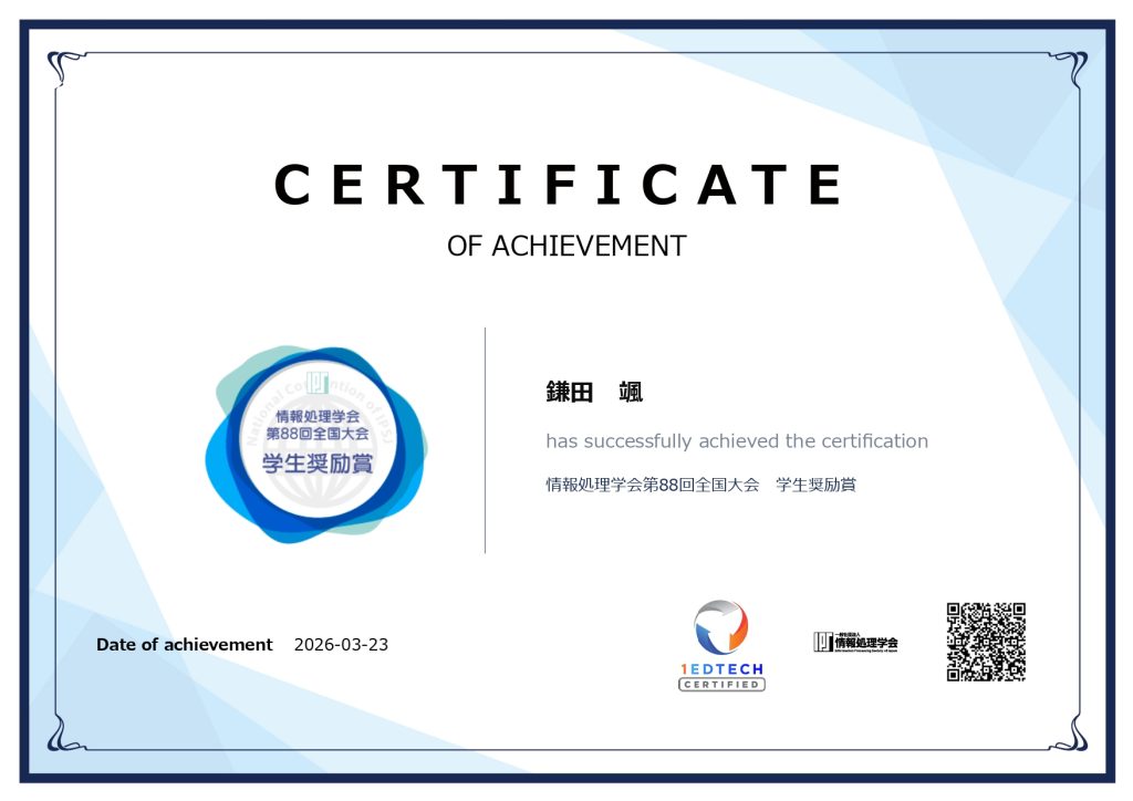 情報処理学会第88回全国大会において、鎌田颯さんが学生奨励賞を受賞しました。
