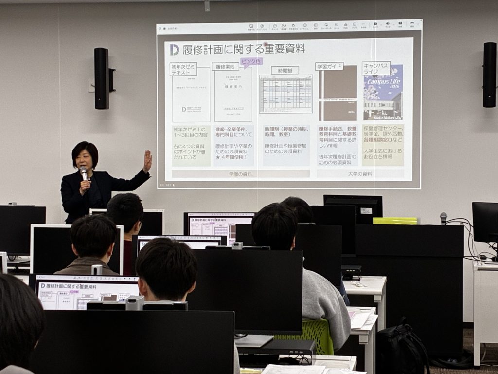 なお、新入生向けには4月6日(月)「新入生ガイダンス」を秋田大学手形キャンパスで実施し、授業の受け方や大学での過ごし方等の説明のほか、二期生担任教員や情報データ科学部教員の紹介等を行いました。また、講義室や図書館等大学構内の案内も行いました。