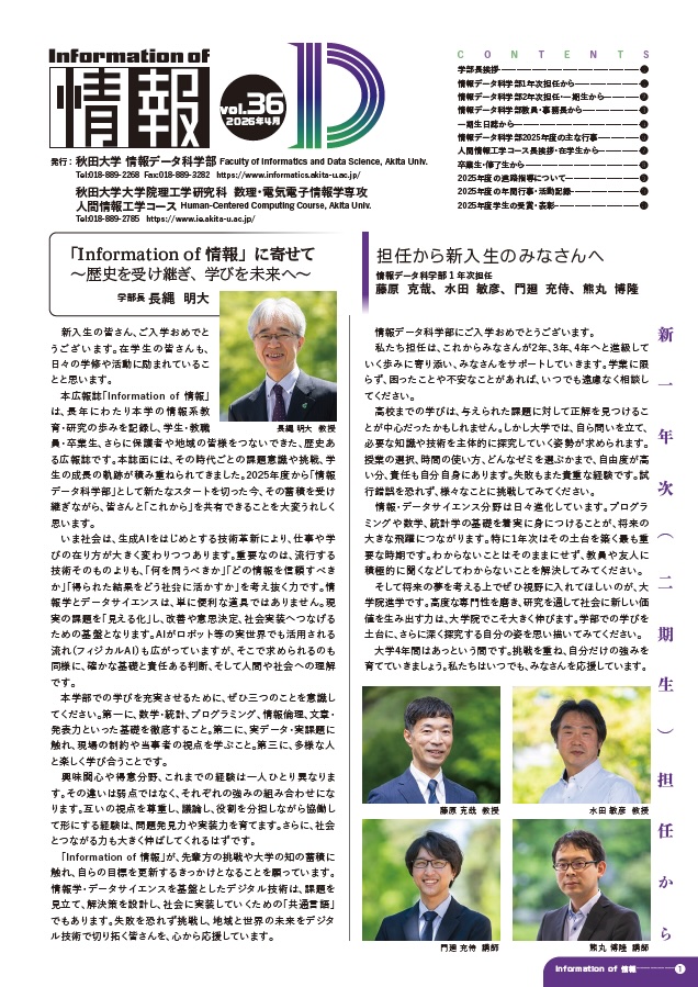 広報誌「Information of 情報」vol.36を発行しました 2026/4/15広報誌「Information of 情報」vol.362026年4月発行PDF「Information of 情報」は、情報データ科学部と人間情報工学コースの広報誌です。2026年4月からは秋田大学情報データ科学部が主体となり秋田大学理工学部人間情報工学コースと共同で発行しています。関連リンク秋田大学人間情報工学コース>広報誌「Information of 情報」